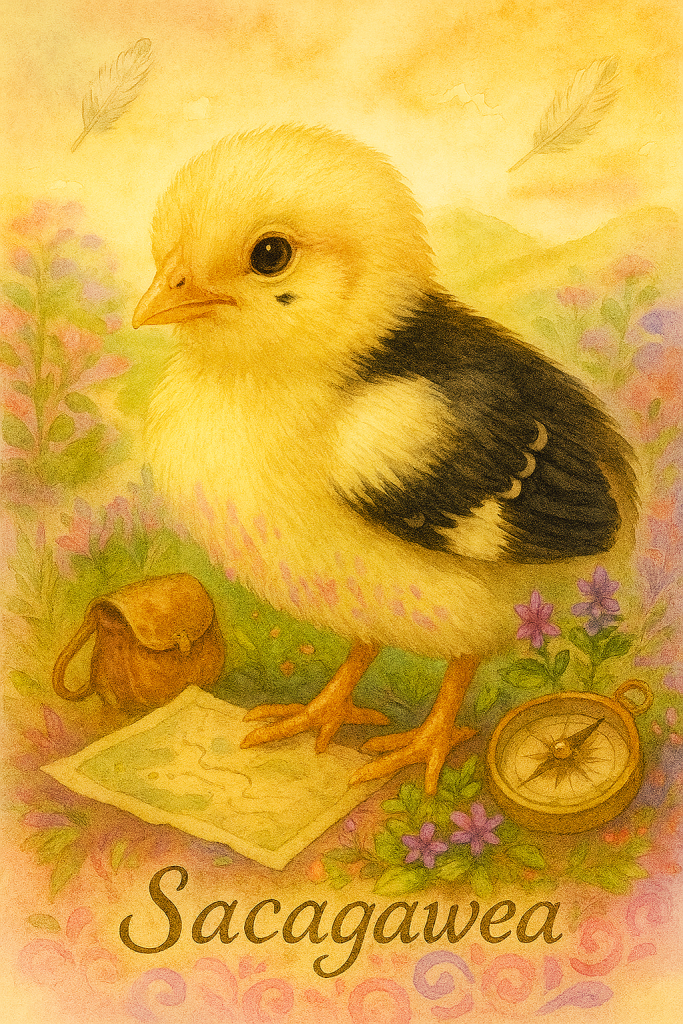 Sacagawea is no ordinary chick. While the others peeped and stumbled around like popcorn in a skillet, she stood tall, watching, learning, leading. You can tell she’s got places to go and birds to guide. She’s the type to figure out how the feeder works… and then show the rest of the flock like, “Here, dummies. Peck here.”