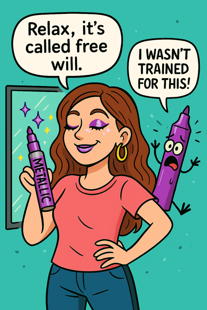 Free will is alive and well. You’re allowed to make weird choices. You’re allowed to be creative without clearing it with a board of dermatologists. You’re allowed to glitter-bomb your face without a three-paragraph disclaimer.